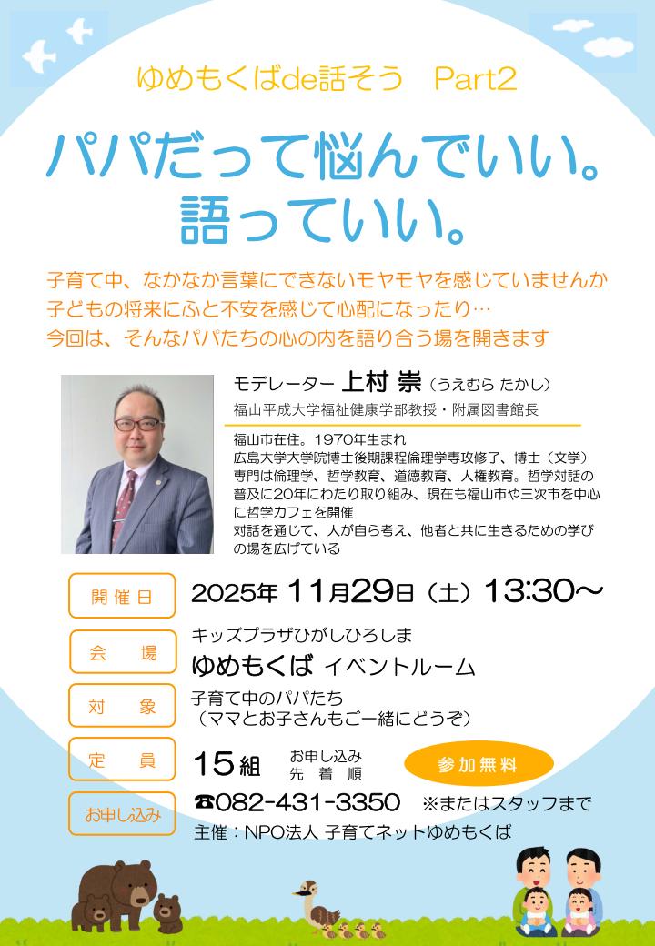 11月29日(土曜日)午後1時30分より、「ゆめもくばde話そう」Part2 として『パパだって悩んでいい。語っていい。』を開きます。
